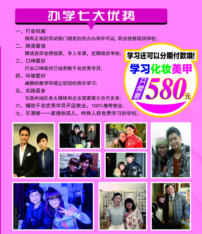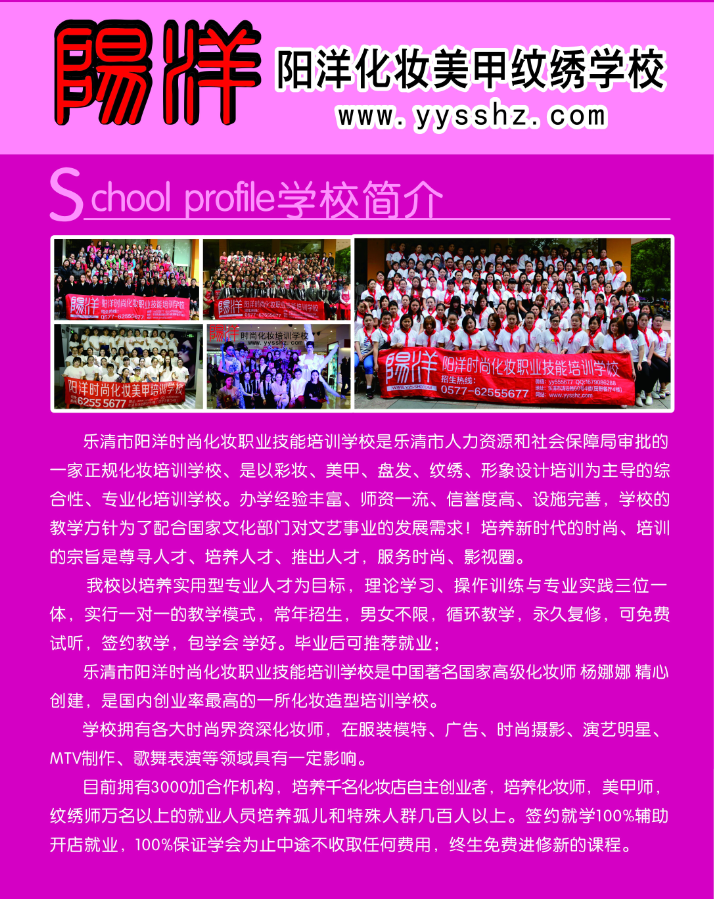以上課程:包學(xué)會,學(xué)不會繼續(xù)留校免費學(xué)習(xí),學(xué)會為止 每年更新課程,可終身免費來校進修相對應(yīng)的新課程(憑畢業(yè)證) ![]() 樂清陽洋時尚化妝美甲紋繡培訓(xùn)學(xué)校