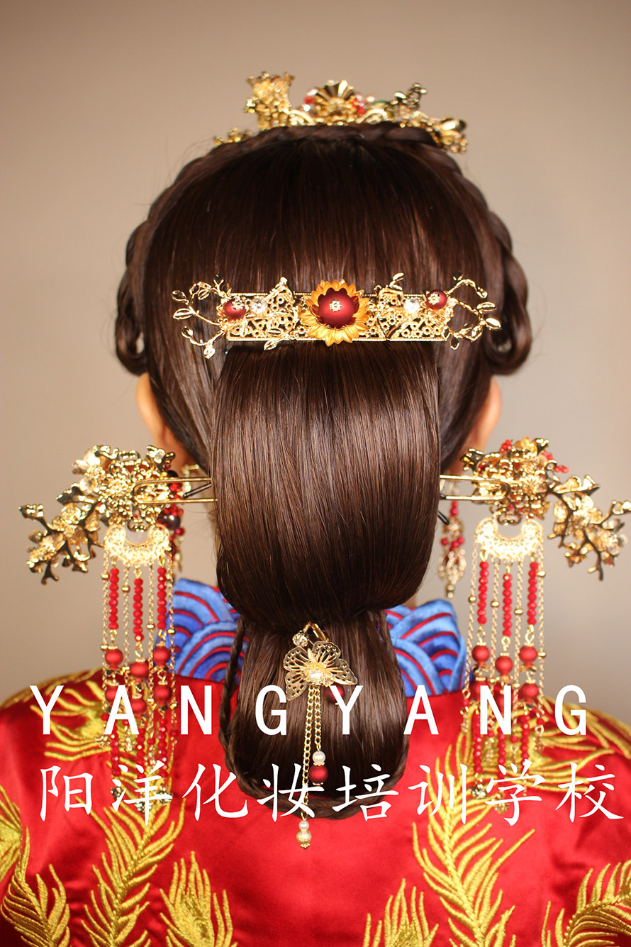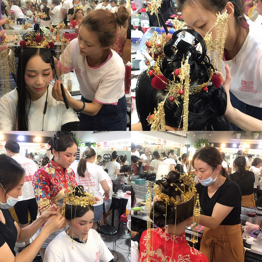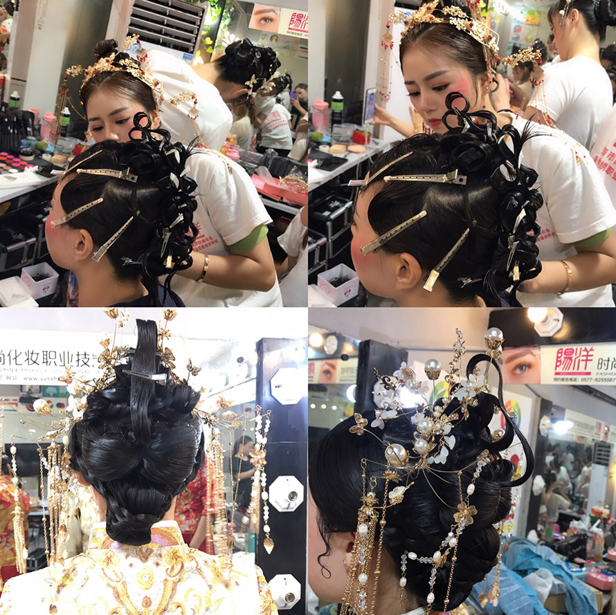 在老師的嚴(yán)格教學(xué)下,在同學(xué)們的努力學(xué)習(xí)后,第一次成功獨(dú)立完成了中式新娘整體造型。