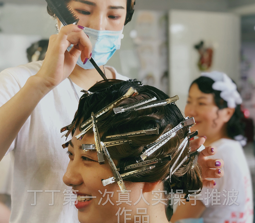 1、 用水做手推波紋:用水噴透在頭發(fā)上,然后右手持梳,左手配合貼著頭皮按壓推擠出“S” 波紋型,用鴨嘴夾固定。然后用吹風(fēng)吹干定型。