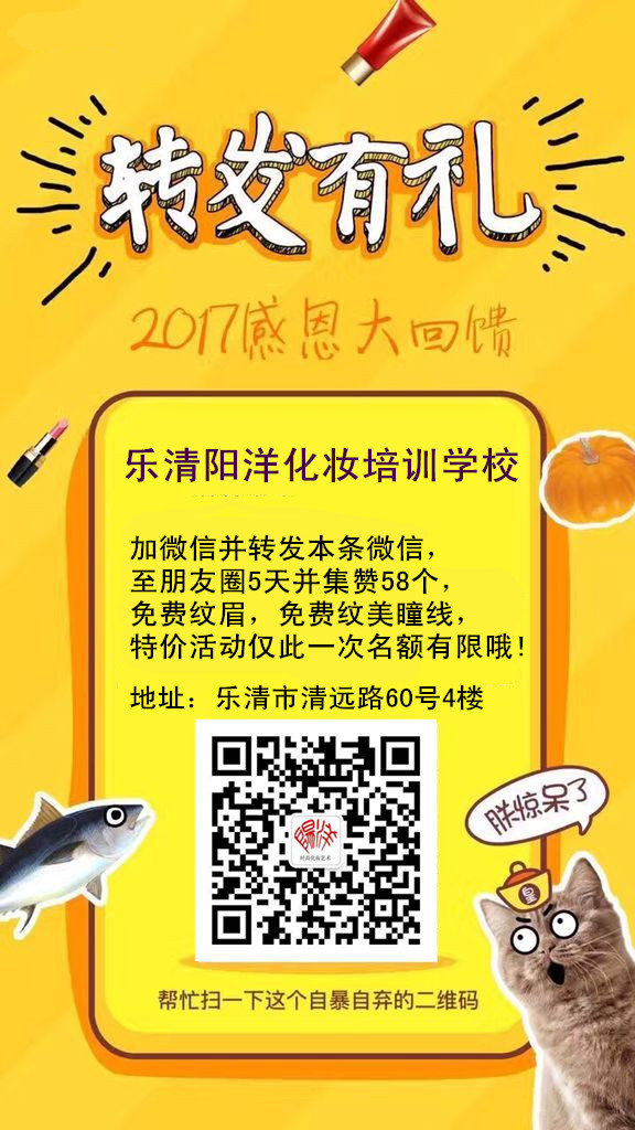 呼應寶寶們的強烈要求,樂清陽洋時尚化妝培訓學校年底來一次半永久活動哈~轉(zhuǎn)發(fā)此文至朋友圈5天并集贊58個+關注公眾號(yysshz567),就可以免費做韓式半永久紋眉或者美瞳線哦,還有呢!轉(zhuǎn)發(fā)第二天就可以打電話預約名額嘍~~進口機器進口色料,記得提前預約時間操作,由于參加活動的寶寶太多,名額有限,滿額恢復原價,雖然是活動也代表著陽洋化妝學校的聲譽,低價不低品質(zhì)、轉(zhuǎn)發(fā)朋友圈十天并集贊68個 并關注公眾號(yysshz567),報名學習陽洋化妝課程立減1000元現(xiàn)金! ![]()
