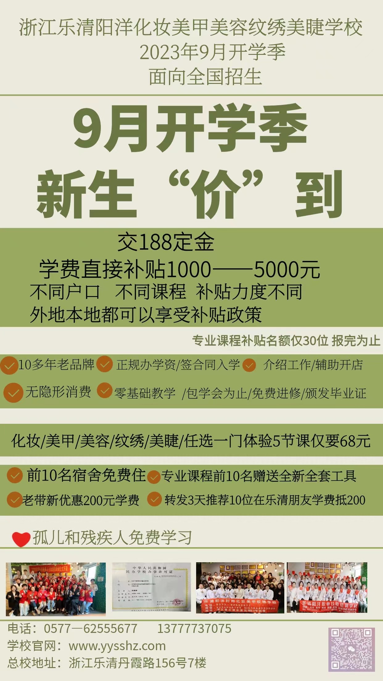 當(dāng)前位置:樂清市陽洋職業(yè)技能培訓(xùn)學(xué)校 » 優(yōu)惠資訊2023年九月開學(xué)季活動(dòng) #溫州樂清哪里有學(xué)化妝美甲美睫美容課程發(fā)布時(shí)間:2023-9-6 15:52:21 瀏覽次數(shù):2012 |