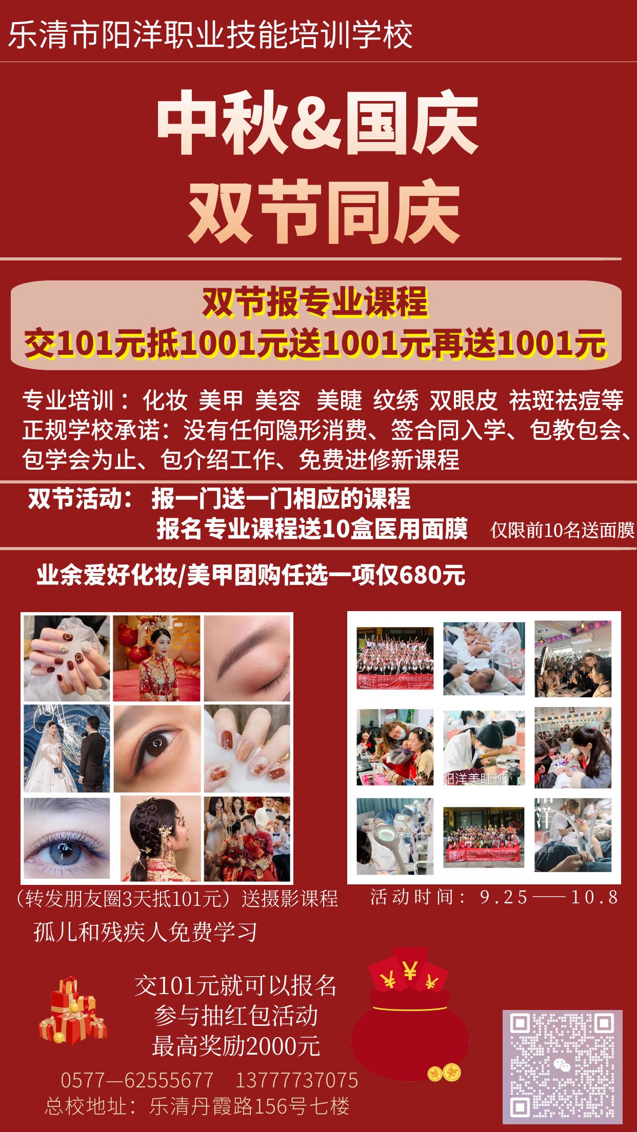 當(dāng)前位置:樂清市陽洋職業(yè)技能培訓(xùn)學(xué)校 » 優(yōu)惠資訊中秋&國慶雙節(jié)同慶活動(dòng)來寵發(fā)布時(shí)間:2023-9-26 22:03:33 瀏覽次數(shù):2008 |