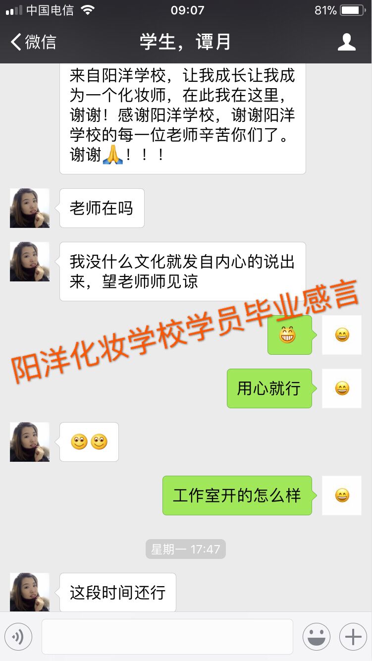 一次和一個(gè)朋友吃飯,聊到我想學(xué)化妝她就給了我楊陽老師的名片,我本是報(bào)著看看的心態(tài)去了解了一下!給我當(dāng)時(shí)的感覺挺好就是價(jià)格有點(diǎn)貴了。然后我去了別的幾家學(xué)校看了了解了,價(jià)格確實(shí)是比陽洋學(xué)校的便宜??晌疫€是來到陽洋學(xué)校,當(dāng)時(shí)給我的印象是陽洋學(xué)校的每一個(gè)老師都感覺很專業(yè),而且每個(gè)老師都化妝上班,這給我的感覺挺好!這也是我沒去其他學(xué)校的原因。因?yàn)閷τ谖乙粋€(gè)沒化個(gè)妝的人自我感覺,一個(gè)化妝師最基本是要把自己化的美美的⋯⋯
