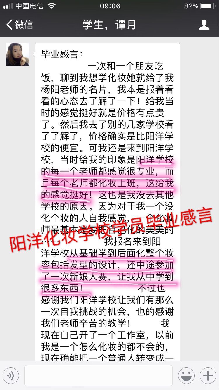 不過也感謝我們陽洋學(xué)校讓我們有那么一次自我挑戰(zhàn)的機(jī)會(huì),也的感謝我們老師辛苦的教學(xué)!我現(xiàn)在自己開了一個(gè)工作室,以前我是一個(gè)怎么化妝的都不會(huì)的,現(xiàn)在確能把一個(gè)普通人轉(zhuǎn)變成一個(gè)美美的新娘,感覺心中有種說不出的自豪感,不過這種自豪感來自陽洋學(xué)校,讓我成長讓我成為一個(gè)化妝師,在此我在這里,謝謝!感謝陽洋學(xué)校,謝謝陽洋學(xué)校的每一位老師辛苦你們了。謝謝