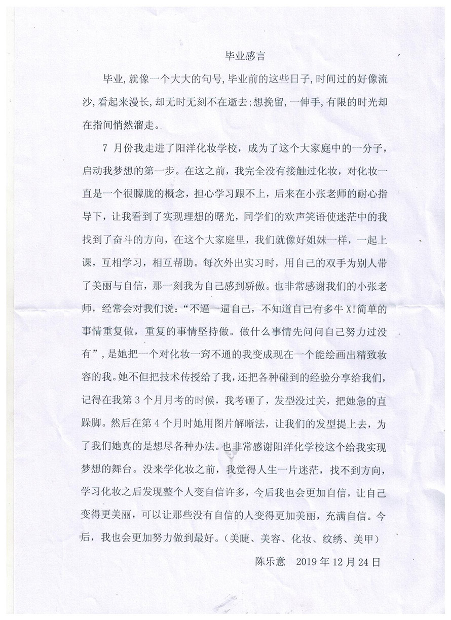 當前位置:樂清市陽洋職業(yè)技能培訓學校 » 學員感悟陳樂意畢業(yè)感言發(fā)布時間:2020-1-13 15:01:49瀏覽次數(shù):1968 |