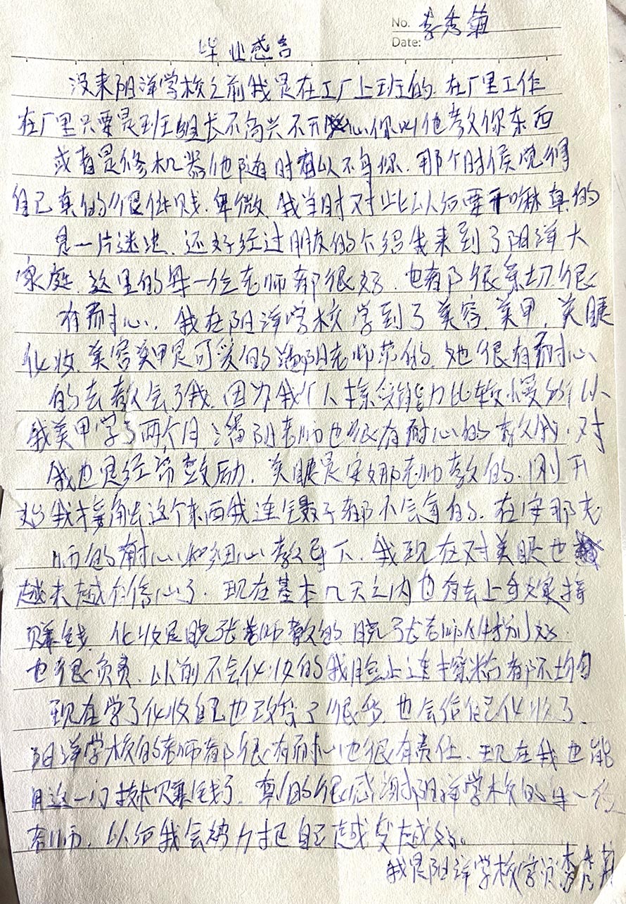 當(dāng)前位置:樂(lè)清市陽(yáng)洋職業(yè)技能培訓(xùn)學(xué)校 » 學(xué)員感悟李秀菊畢業(yè)感言發(fā)布時(shí)間:2021-12-22 15:41:39瀏覽次數(shù):1983 |