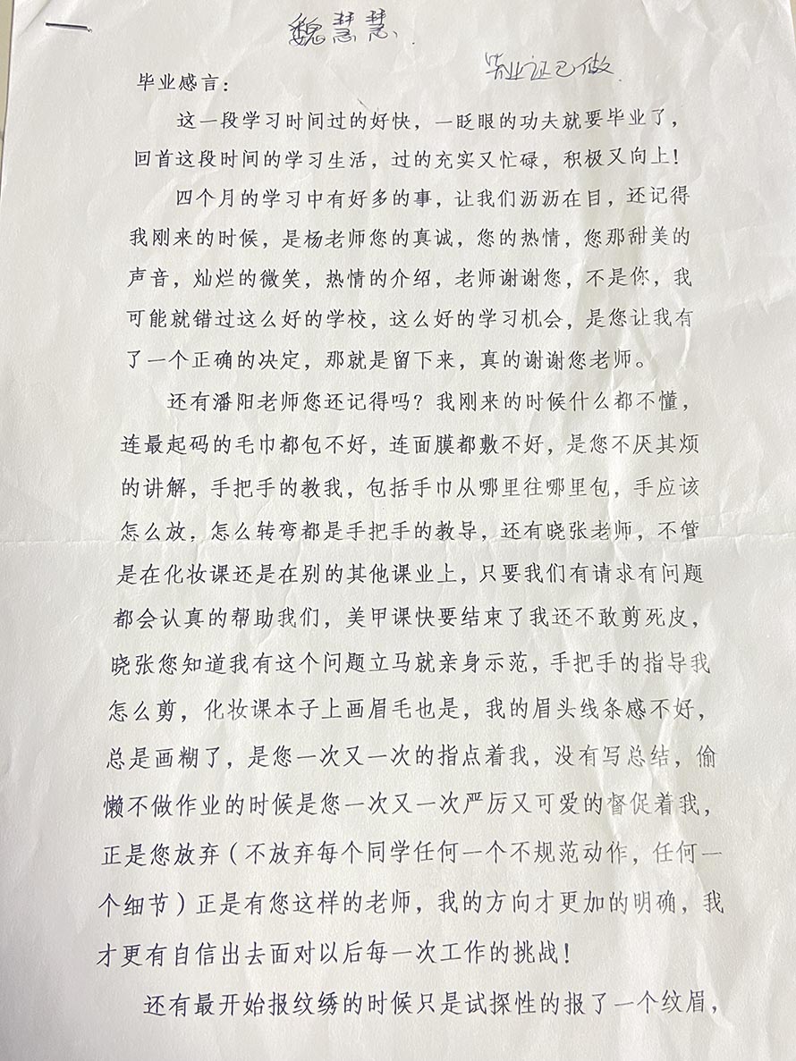 當前位置:樂清市陽洋職業(yè)技能培訓學校 » 學員感悟魏慧慧畢業(yè)感言發(fā)布時間:2021-12-23 10:12:05瀏覽次數(shù):1975 |