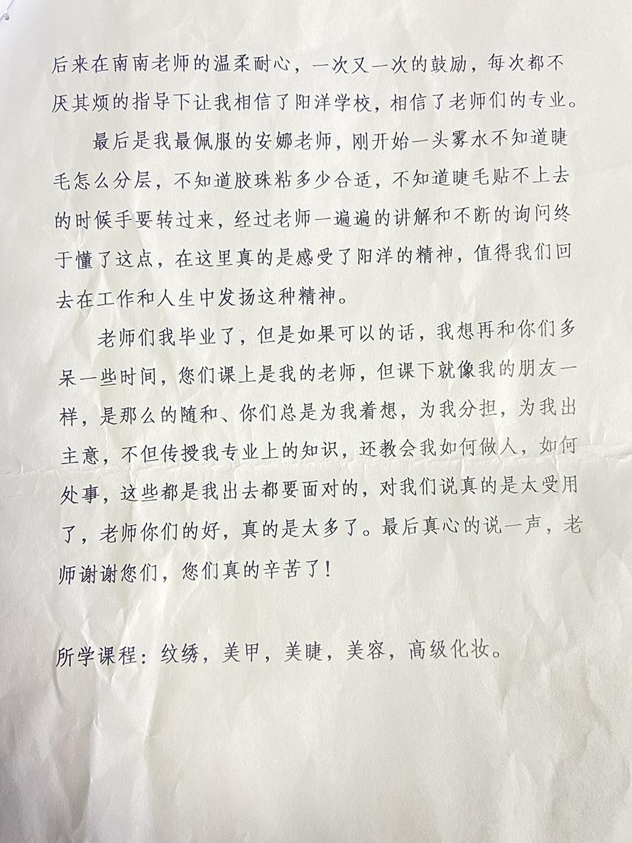 在聽說樂清市只有我們陽洋化妝職業(yè)技能培訓學校是正規(guī)的化妝學校以后, 果斷選擇了來陽洋學習技術(shù),她是比較有目標有規(guī)劃的,但同時也比較保守, 先選擇學習了一門課程,通過我們專業(yè)老師的耐心指導(dǎo),一對一手把手教學以后, 她感覺自己深深的感動了,所以有選擇學習了其他課程,成為全能型的美業(yè)人才!