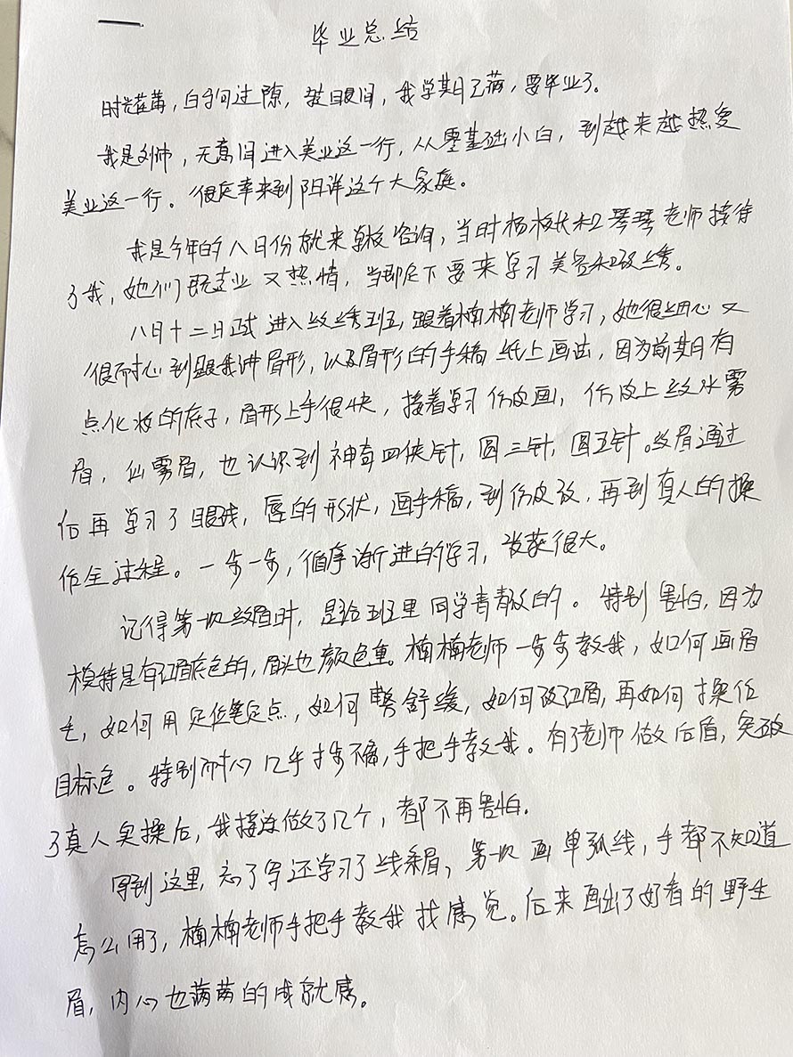 最開始學習的是紋繡項目,因為紋繡是當下市場來說來錢最快的一個項目, 在經過專業(yè)老師的耐心指導,一對一手把手教學以后,她感受到老師的專業(yè)程度以及 認真負責人的教學態(tài)度,她選擇繼續(xù)學習其他課程,做一名全能的美業(yè)人才。