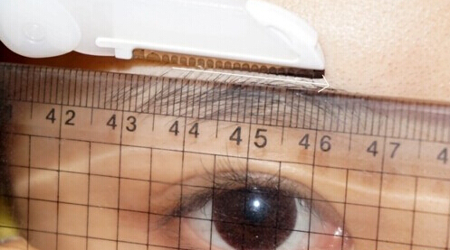 Step 2:尺子放在眉毛下邊緣,同樣用臉部專用剃刀刮去多余的雜毛,使眼周干凈整潔。