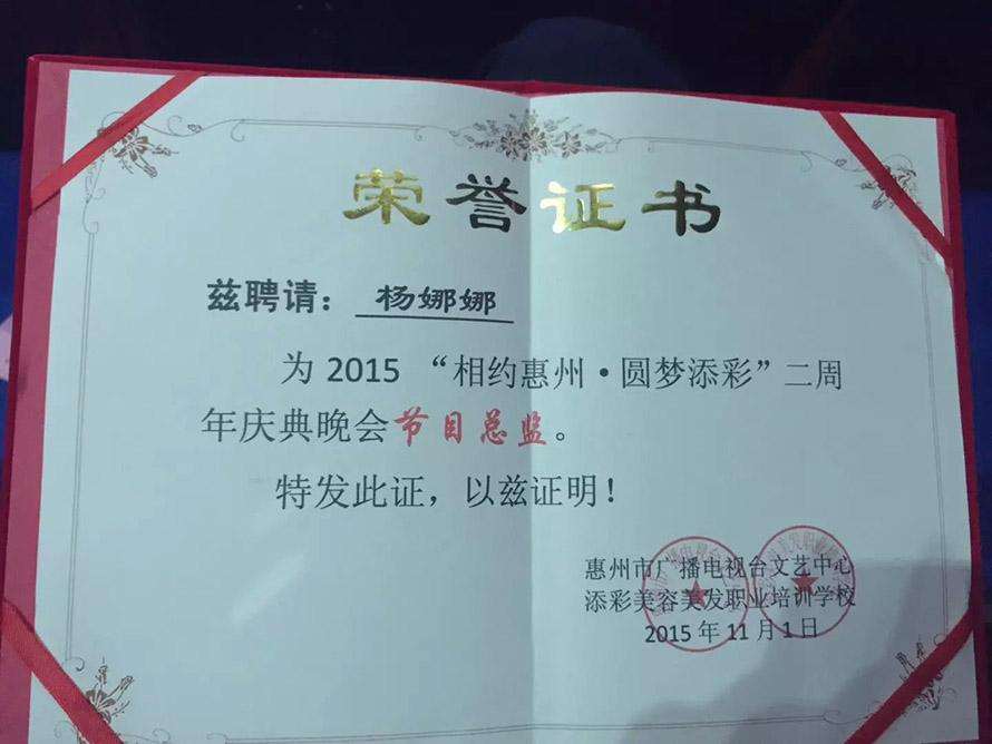 惠州電視臺“相約惠州 圓夢添彩"慶典晚會11月1日惠州市拉開帷幕,慶典晚會的節(jié)目總監(jiān)由 樂清陽洋時(shí)尚化妝美甲培訓(xùn)學(xué)校的中國著名化妝造型師、國家組化妝大賽評委、楊娜娜老師擔(dān)任,樂清陽洋時(shí)尚化妝培訓(xùn)學(xué)校是 楊娜娜老師精心創(chuàng)建是國內(nèi)一流的時(shí)尚化妝美甲紋繡學(xué)校。十四年內(nèi)參與國內(nèi)大型比賽榮獲多次獎項(xiàng),妝面造型風(fēng)格受到業(yè)內(nèi)的高度好評,優(yōu)秀學(xué)生更是遍布全國各地。