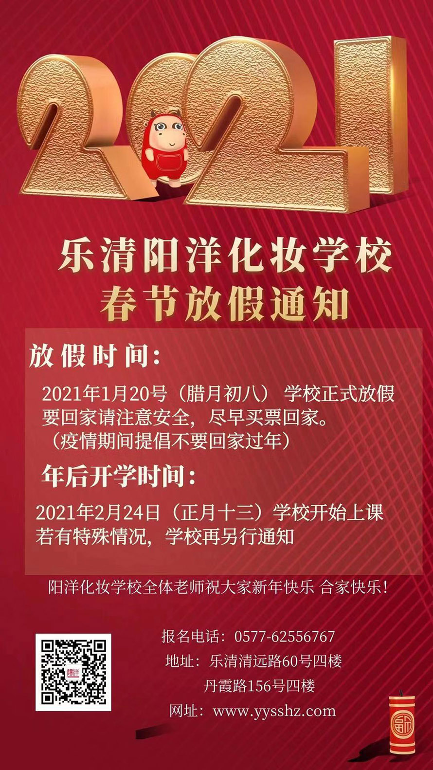 當(dāng)前位置:樂清市陽洋職業(yè)技能培訓(xùn)學(xué)校 » 學(xué)校新聞樂清陽洋時尚化妝培訓(xùn)學(xué)校2021年春節(jié)放假通知!發(fā)布時間:2021-1-15 15:13:02 瀏覽次數(shù):1961 |