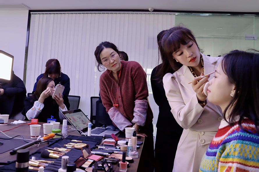 妝容實操中,實操過程中一邊教學(xué),
