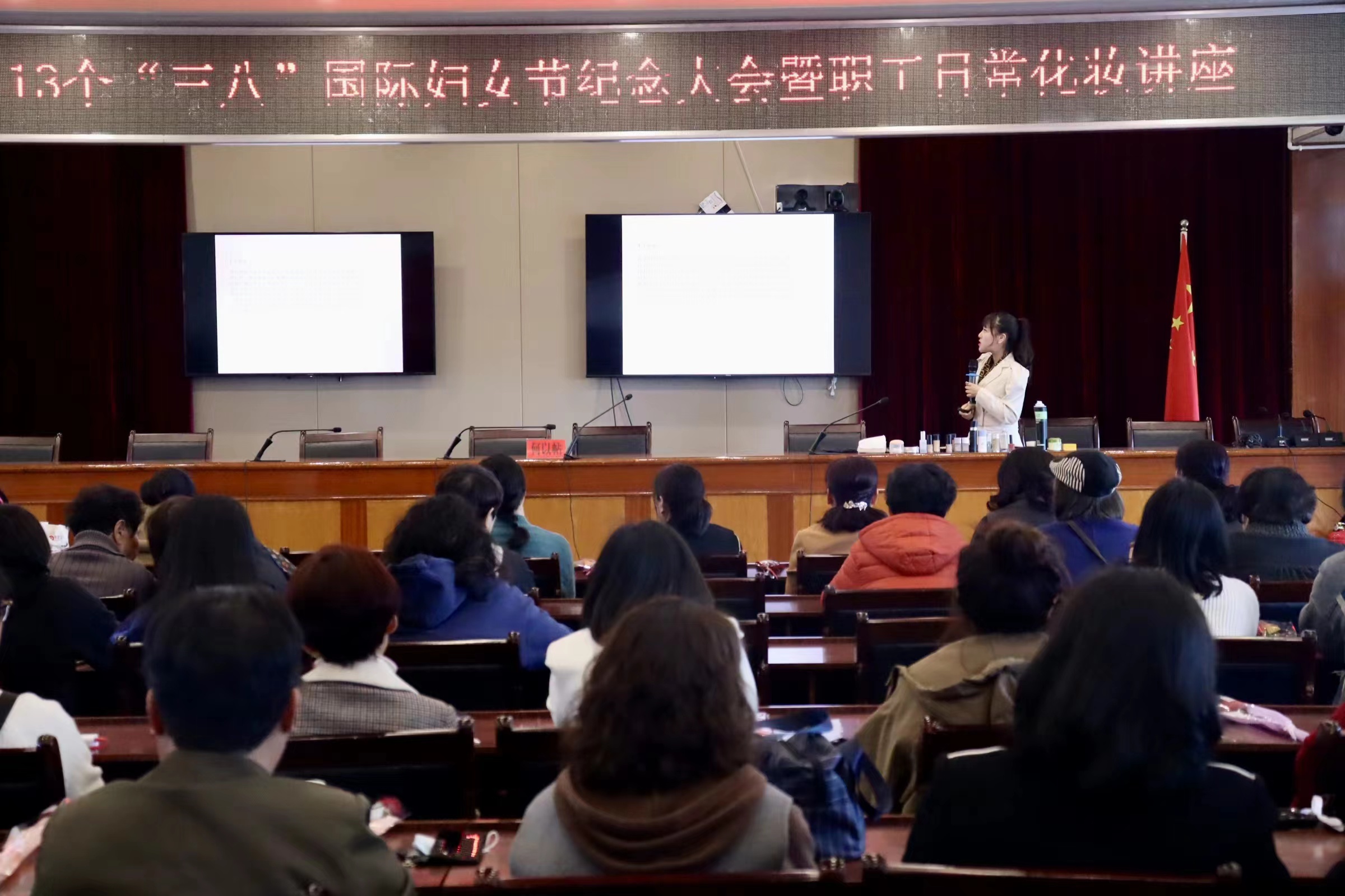 2023年3.8女神節(jié) 陽洋化妝職業(yè)培訓(xùn)學(xué)校很榮幸受樂成街道的邀請(qǐng) 由學(xué)校創(chuàng)始人楊娜娜為機(jī)關(guān)單位女性同胞授課——自我化妝班 開展公益化妝講座,再次感謝總工會(huì)的邀請(qǐng)