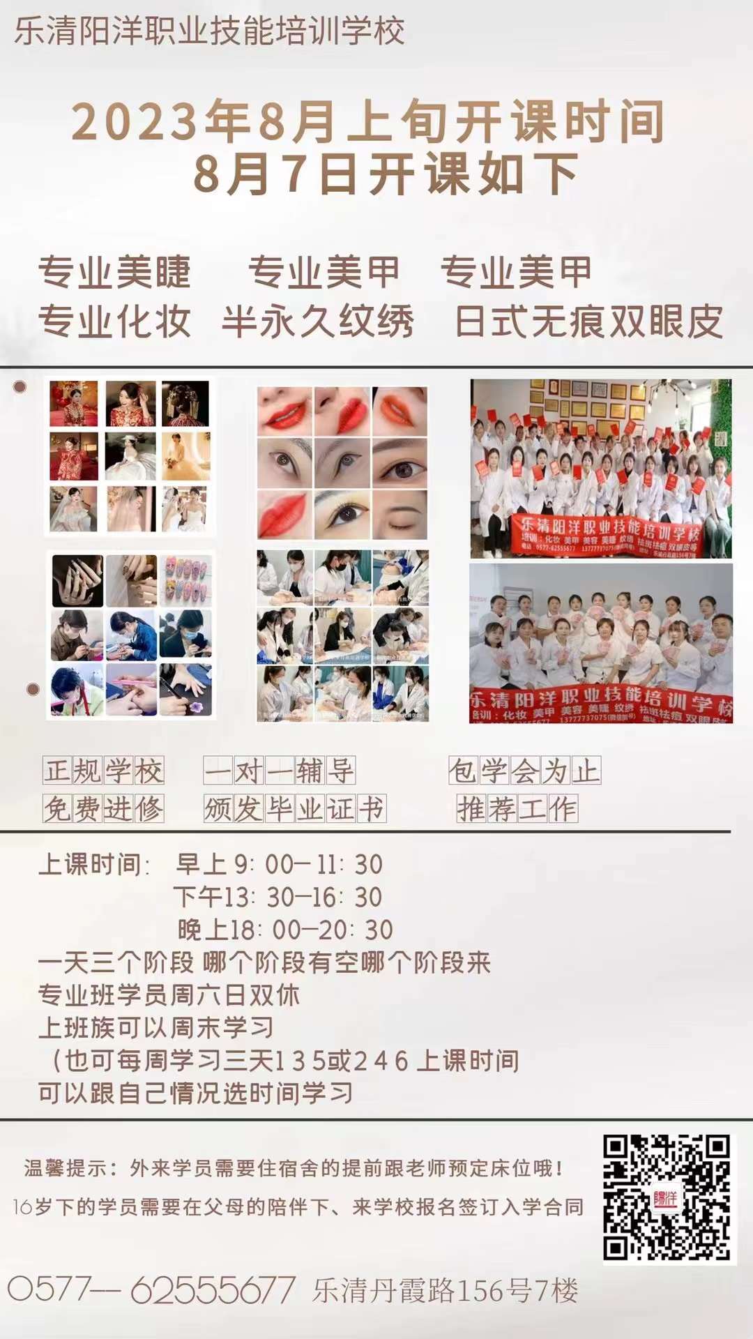 當前位置:樂清市陽洋職業(yè)技能培訓學校 » 學校新聞八月新班開課,八月七日起,快來加入我們吧發(fā)布時間:2023-8-2 19:01:43 瀏覽次數(shù):1954 |
