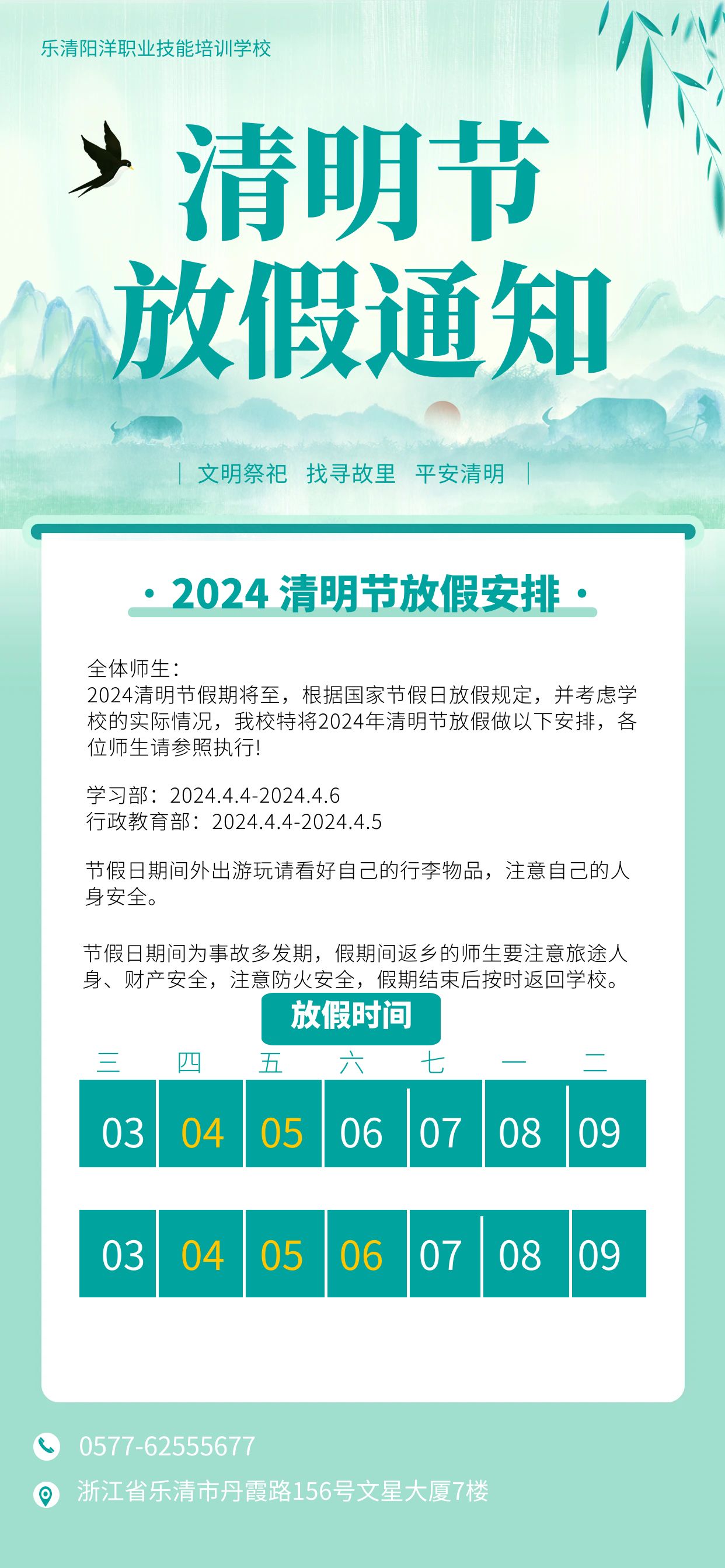 當(dāng)前位置:樂清市陽洋職業(yè)技能培訓(xùn)學(xué)校 » 學(xué)校新聞清明放假通知發(fā)布時間:2024-4-2 9:06:25 瀏覽次數(shù):1959 |