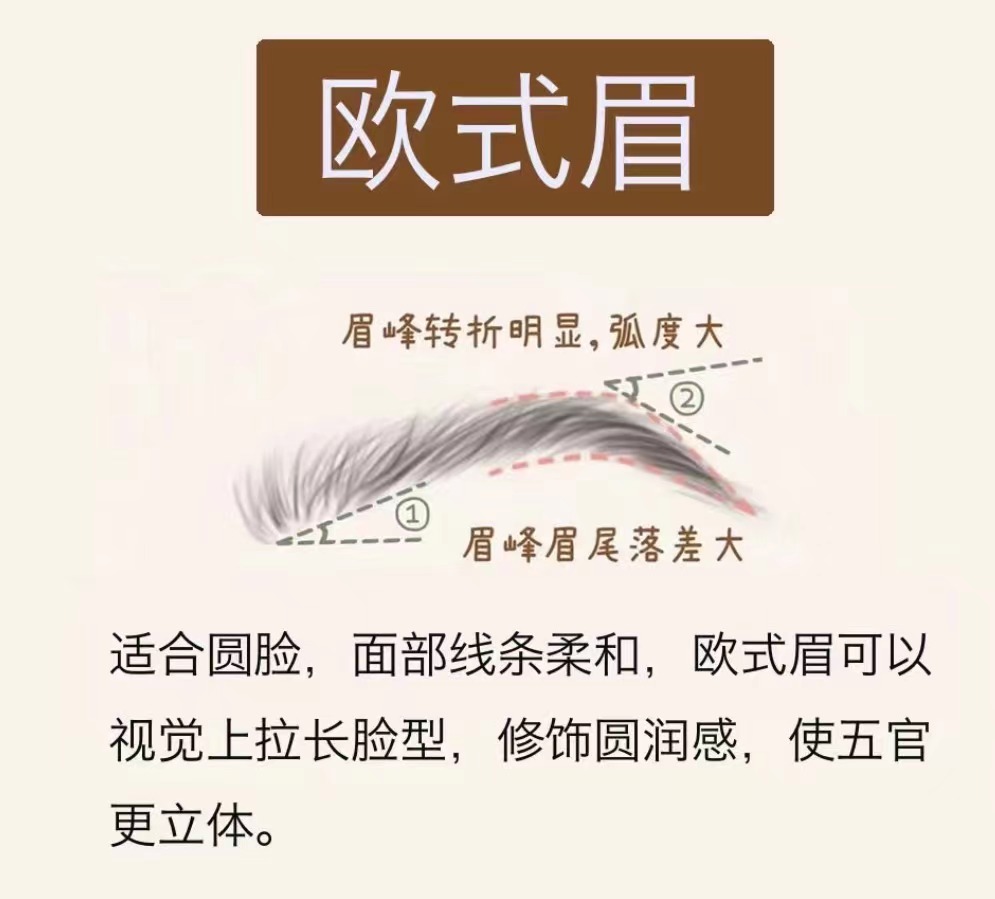 畫法技巧: 眉頭最寬,呈方圓形 眉峰弧度較大,但沒有小挑眉弧度大眉尾自然收窄,略高于眉頭