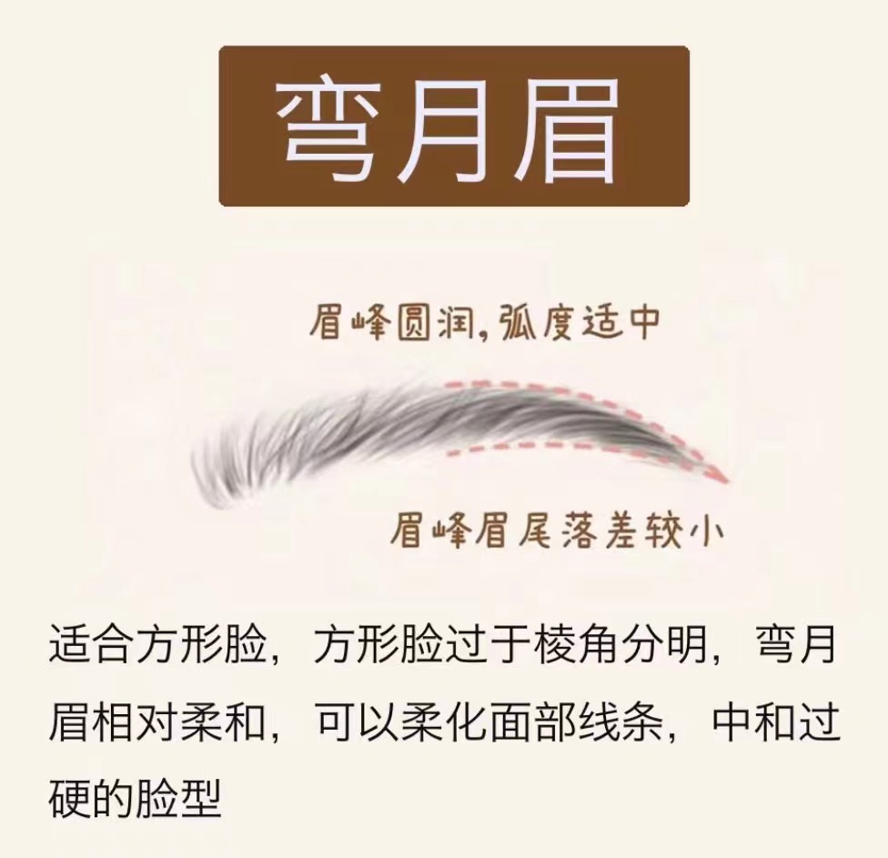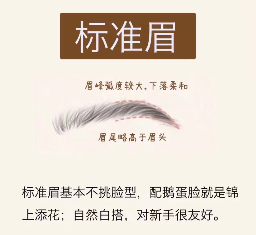 畫法技巧: 眉毛整體定點與標(biāo)準(zhǔn)眉比較接近 眉峰到眉尾自然向下,眉峰較為圓潤 眉毛整體線條柔和,粗細(xì)均勻,弧度適中