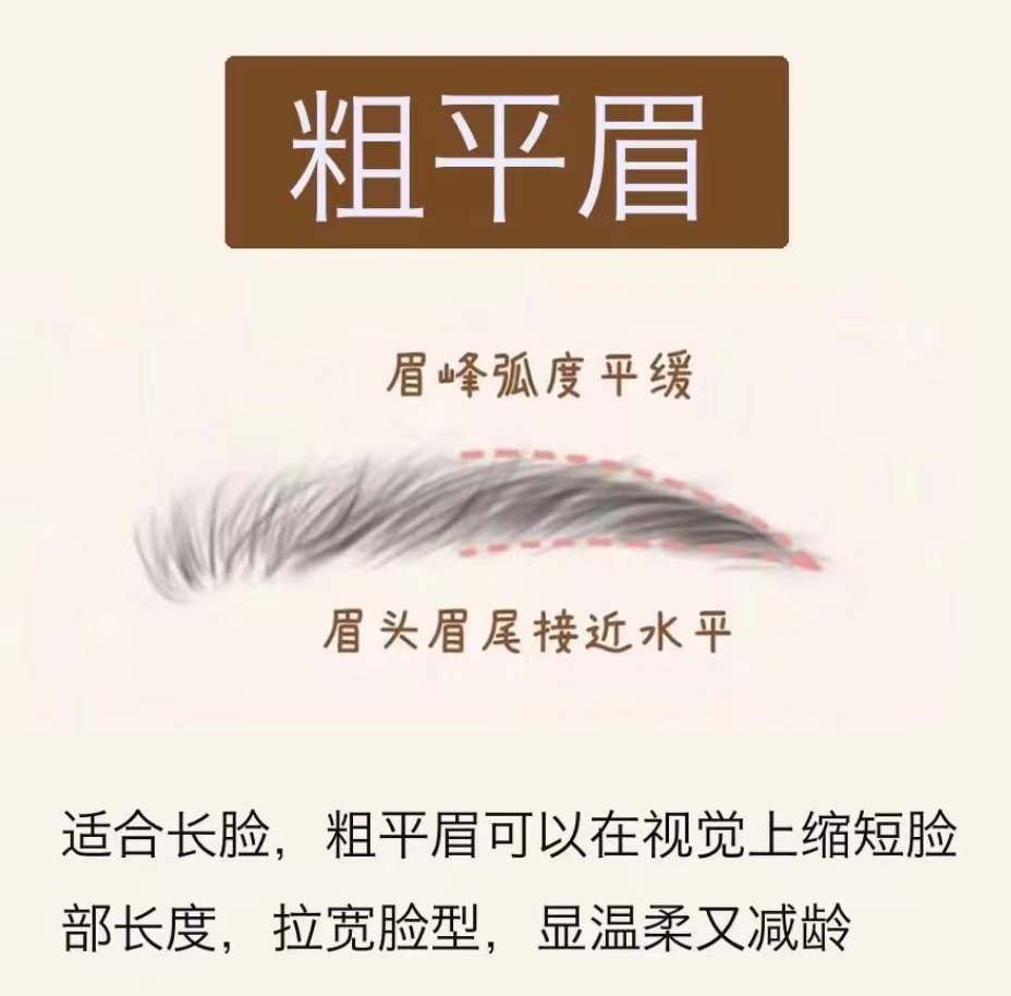畫法技巧: 眉毛整體比較平緩,沒有明顯的弧度眉底線接近水平,略顯弧度眉毛略粗,眉尾拉長,平衡長款比例