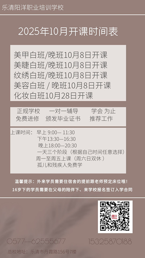 當前位置:樂清市陽洋職業(yè)技能培訓學校 » 學校新聞2025年10月開課時間表|樂清哪里有學化妝|柳市哪里有學化妝|虹橋哪里有學化妝|學化妝多少錢|發(fā)布時間:2025-9-29 16:00:06 瀏覽次數(shù):40 |