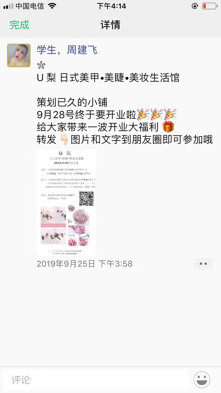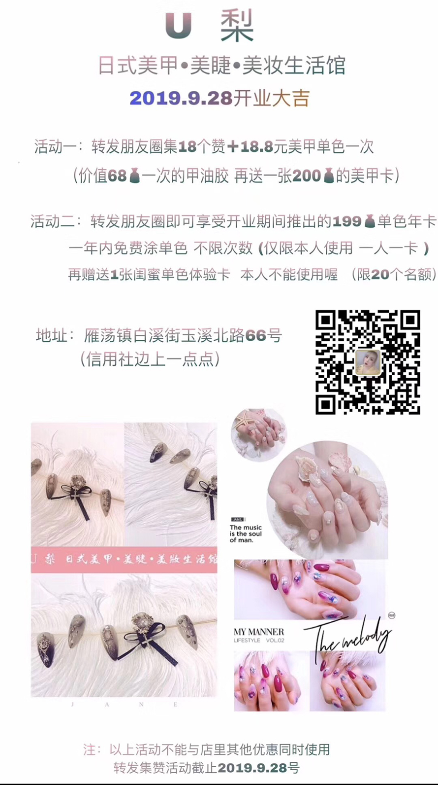 2019年來自雁蕩的周建飛同學(xué) 3月份來校報(bào)名學(xué)習(xí),8月份畢業(yè)于陽洋化妝學(xué)校 在校學(xué)習(xí)了國際化妝大師班+美甲創(chuàng)業(yè)班+高級(jí)美睫班+紋繡精英班 八月份畢業(yè),九月份就開始自己的創(chuàng)業(yè)之旅 在雁蕩當(dāng)?shù)亻_了屬于自己的“U梨”工作室