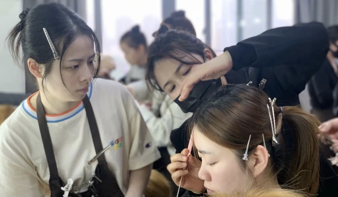 在課堂上同學(xué)們?cè)诩偃祟^上練習(xí)學(xué)習(xí)到新發(fā)型, 假人頭上的造型合格之后,在真人的頭發(fā)上進(jìn)行實(shí)操, 我校教學(xué)秉承著實(shí)操落地為主理論教學(xué)為輔的教學(xué)模式。