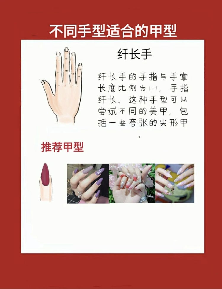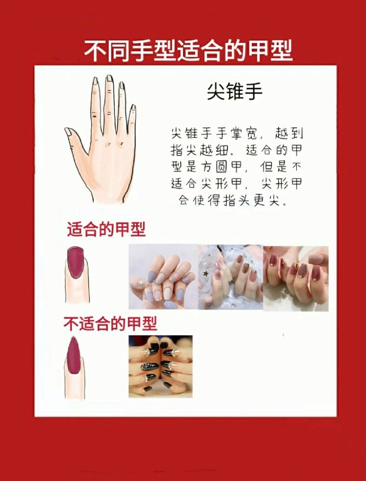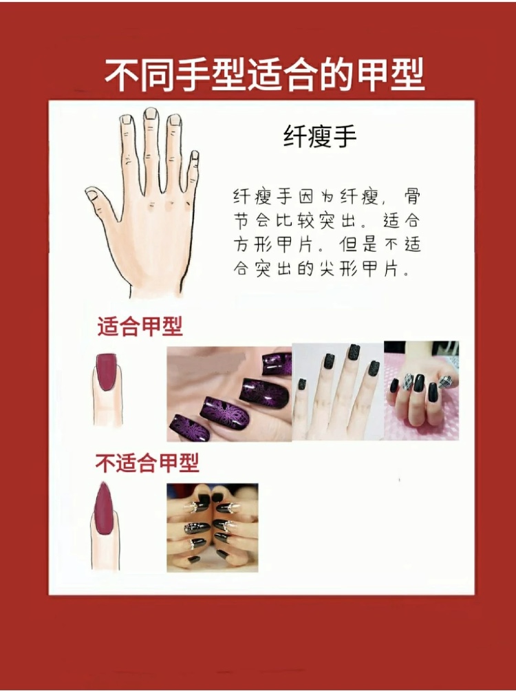 適合的甲型是方圓甲,但是不 適合尖形甲,尖 形甲會使得指頭更尖。