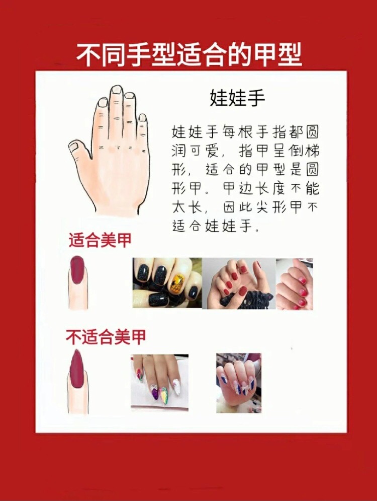 娃娃手每根手指都圓潤可愛,指甲呈倒梯形,適合的甲型是圓形甲。