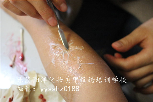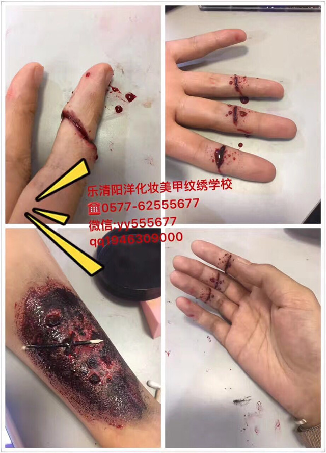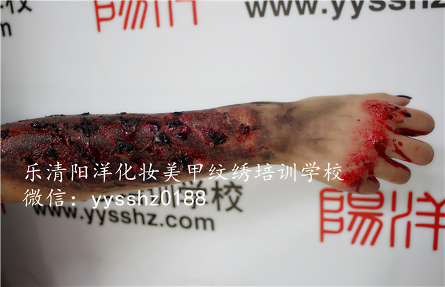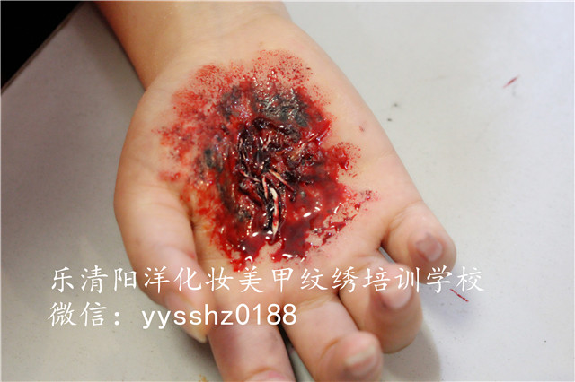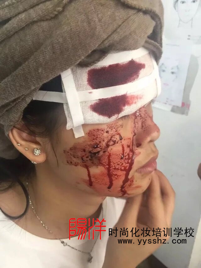 陽洋學校特效妝課堂 大家都知道,電影、電視劇里經(jīng)常會有各種傷痕累累的鏡頭,戰(zhàn)場上士兵英勇負傷、動作片里動不動就血花四濺,當你為電視里的主角們身上、臉上的上而黯然神傷的時候,你可能忘了那些傷全部都是化妝師們的巧手畫出來的哦!