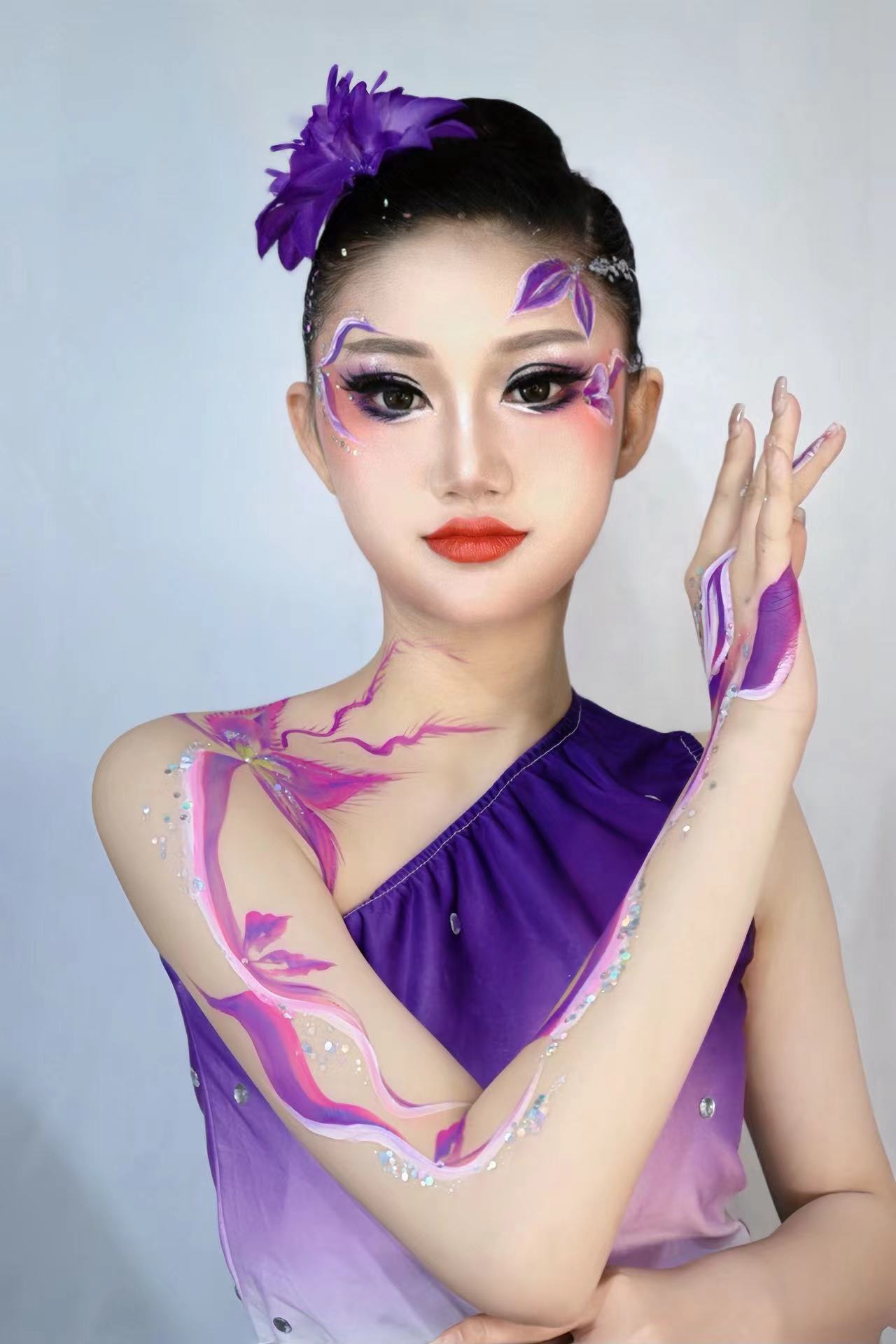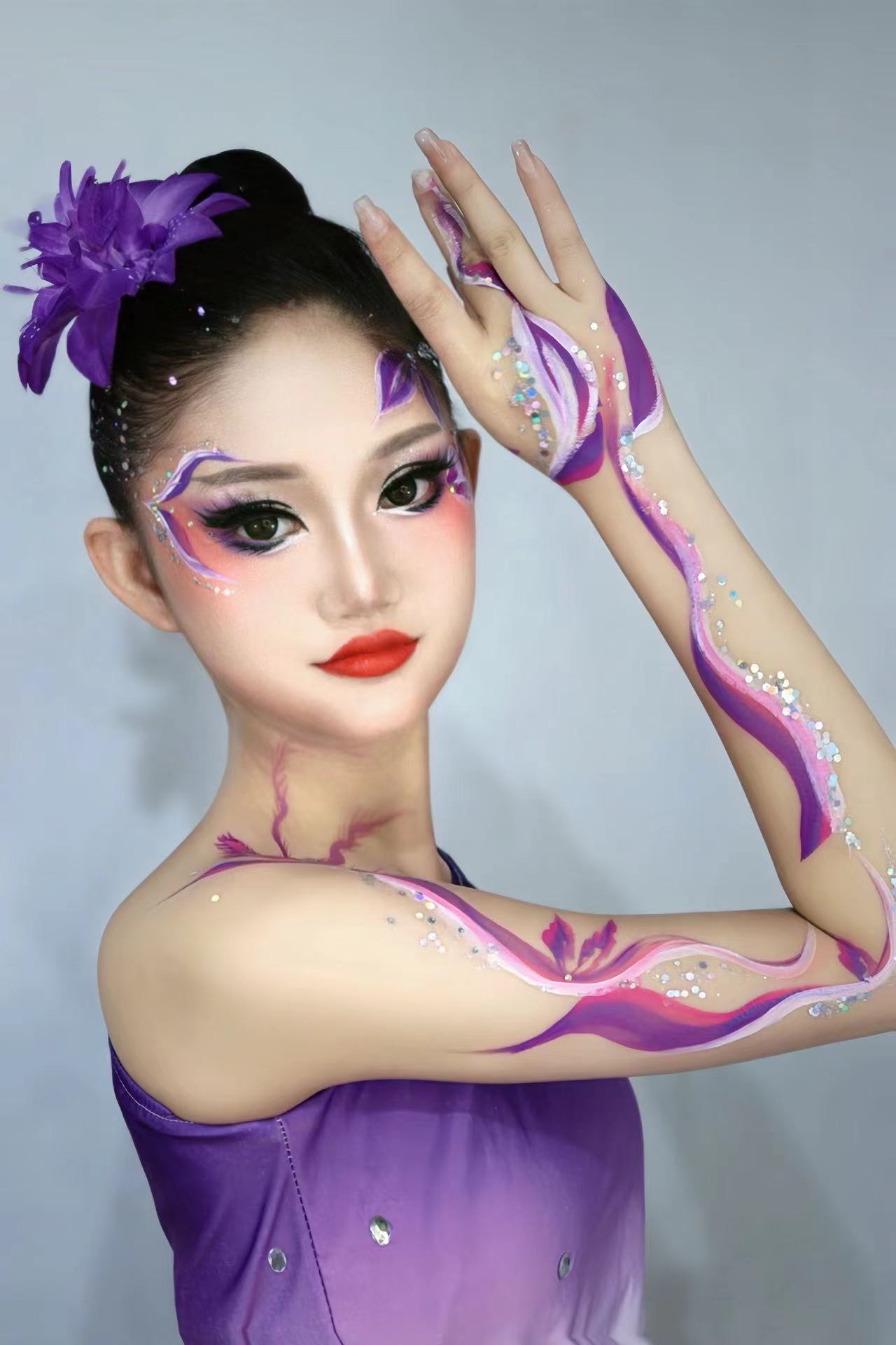 , 面部妝容只是呈現(xiàn)一部分, 加上手臂的彩繪整個延展線條的流動性, 以紫色為主,搭配其他色彩加以點(diǎn)綴, 適量亮鉆的運(yùn)用,更加生動又氣質(zhì)。